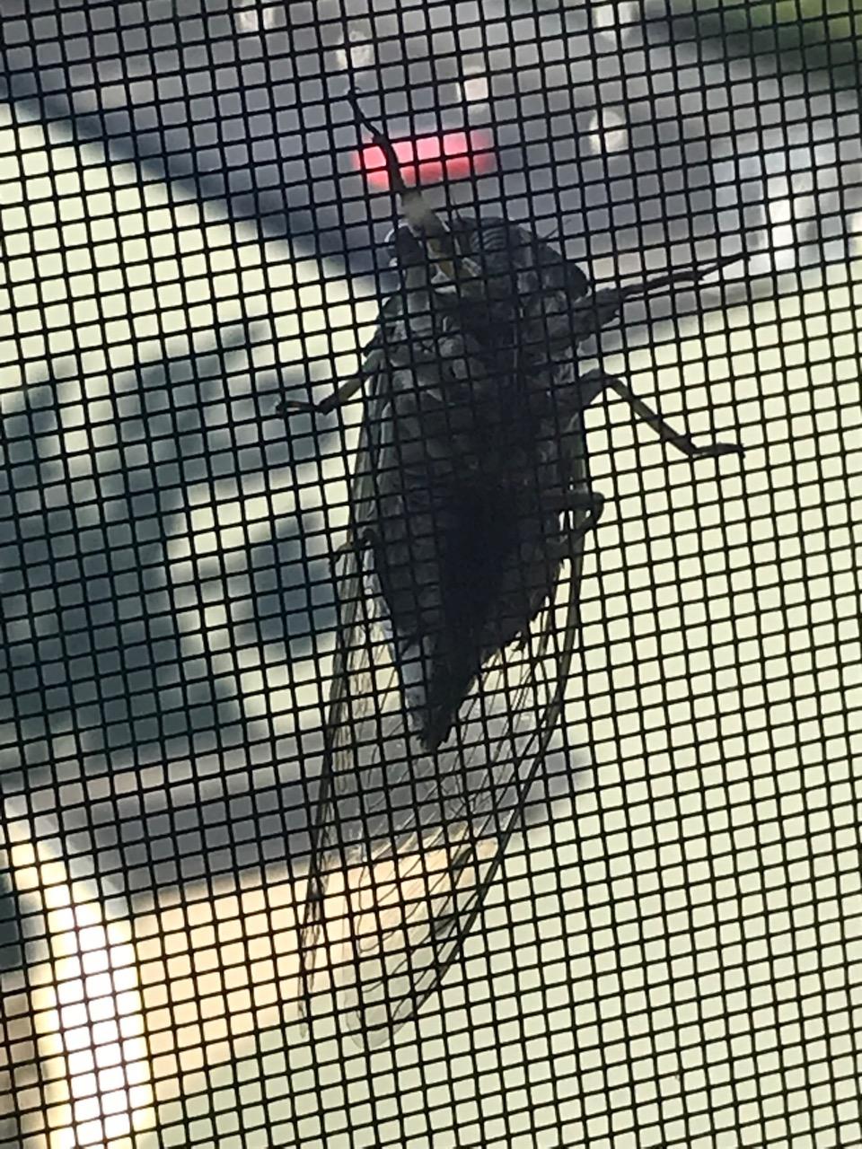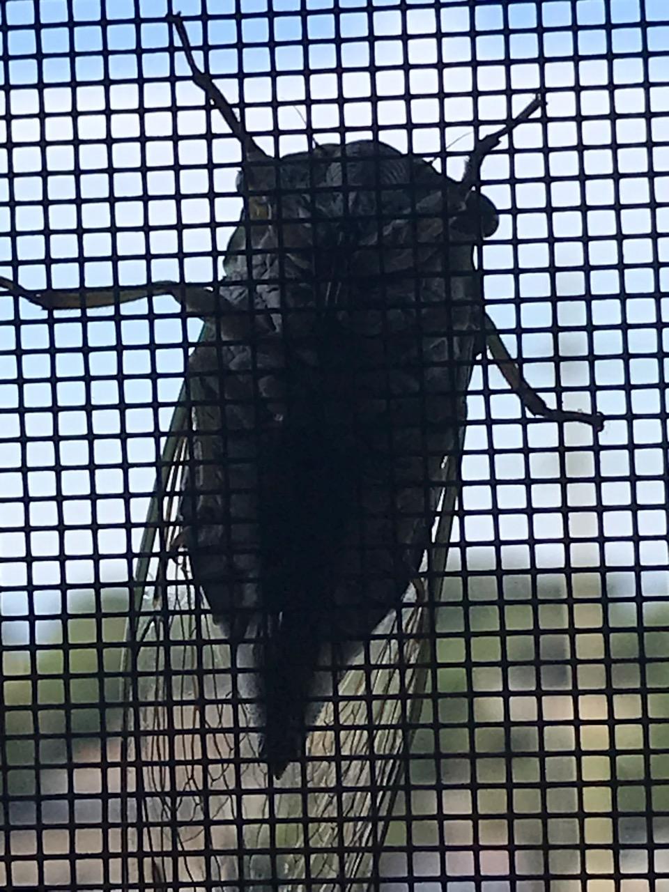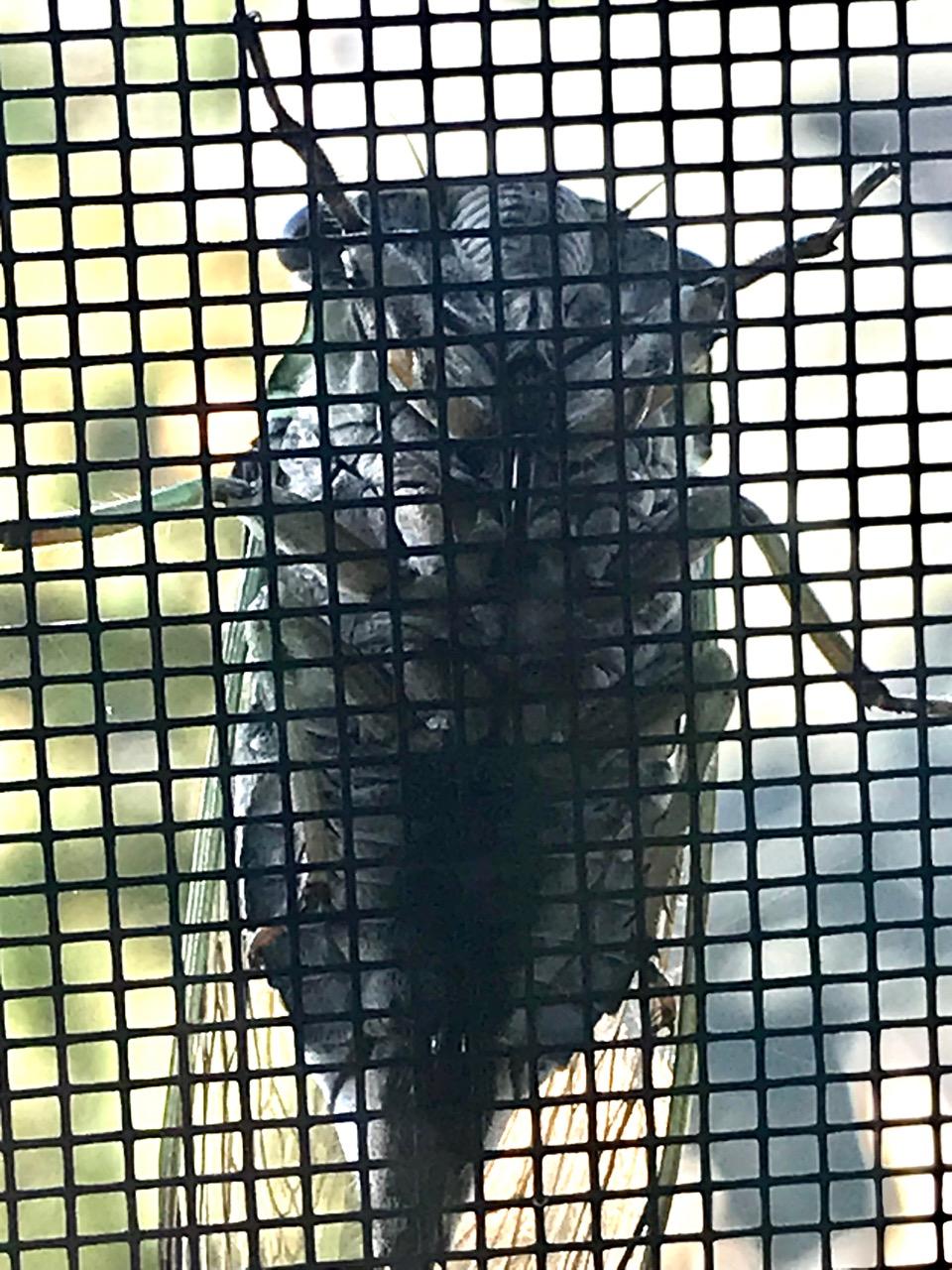 I open the blinds and there clings an insect to the screen. Big as far as insects I’ve seen go.