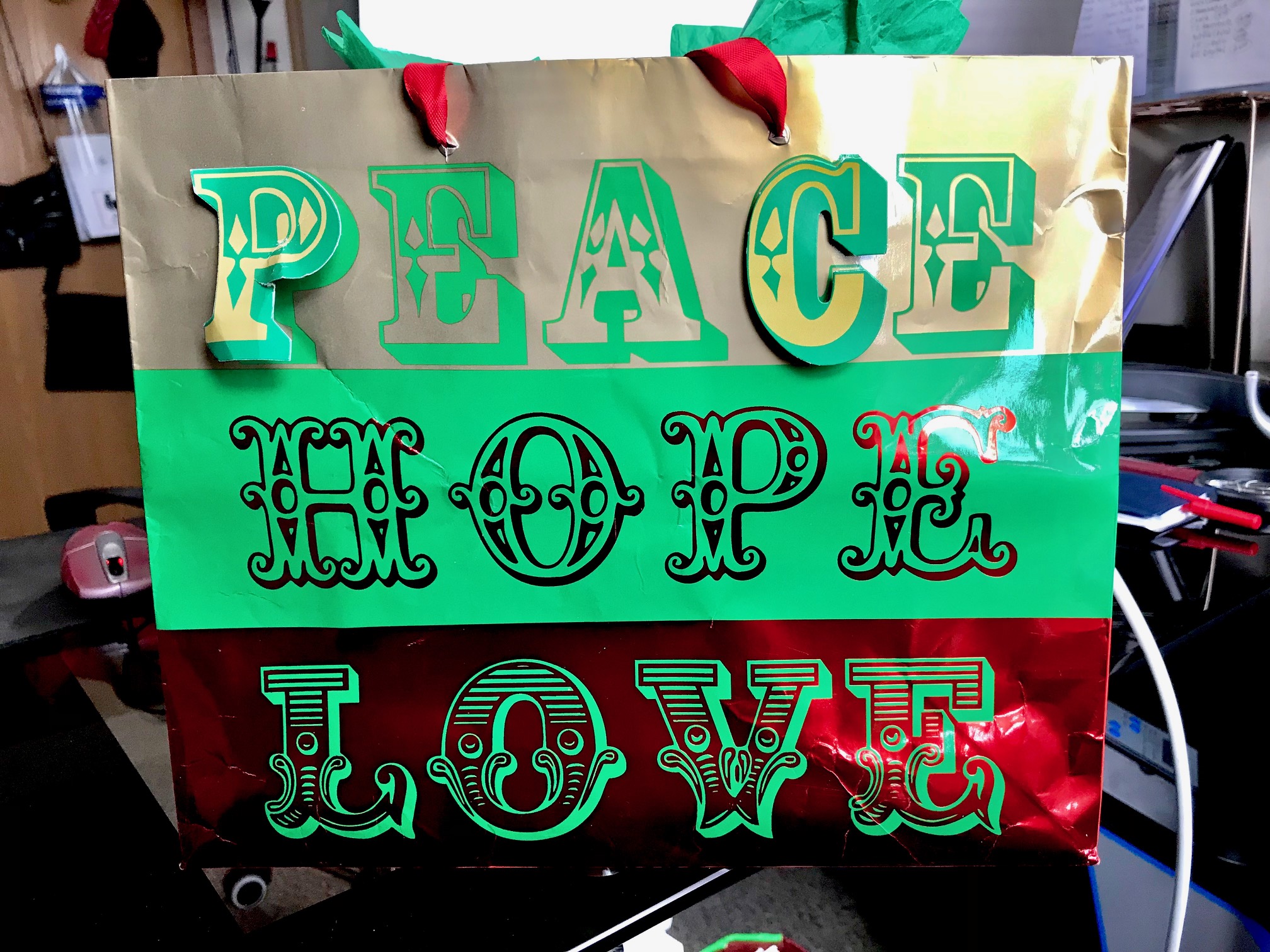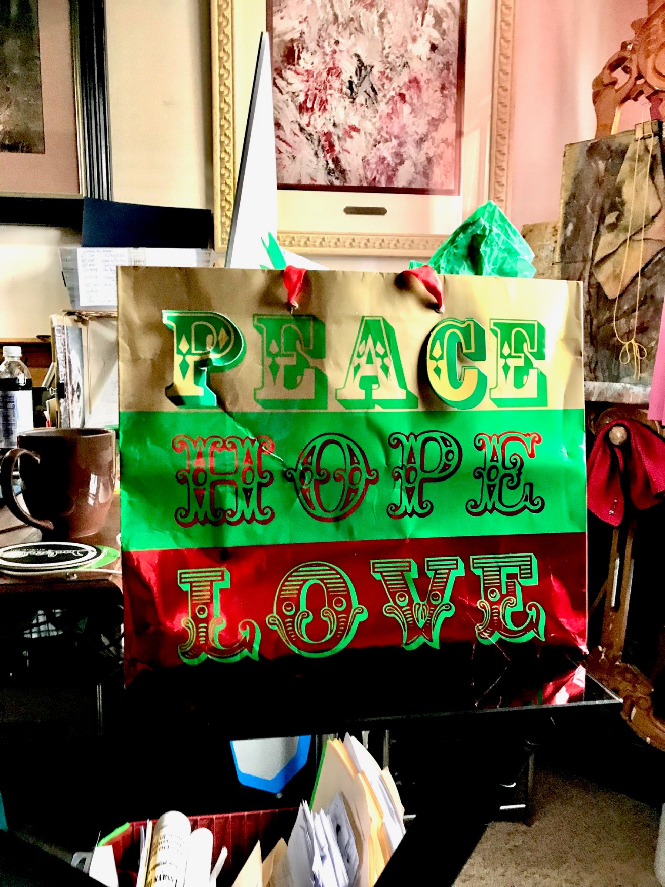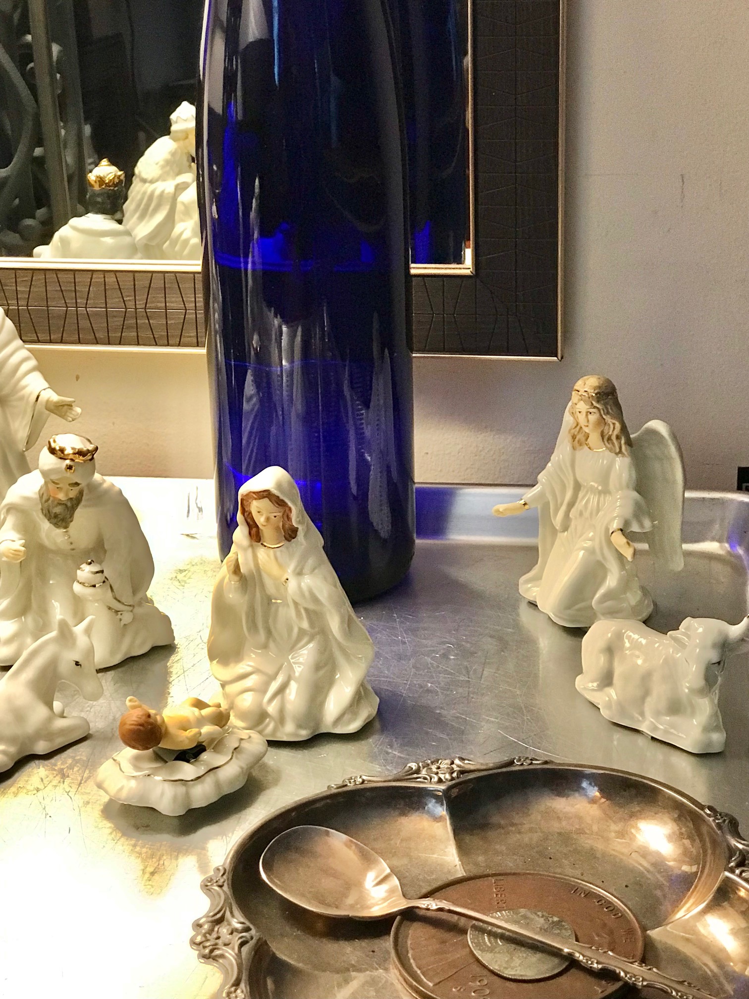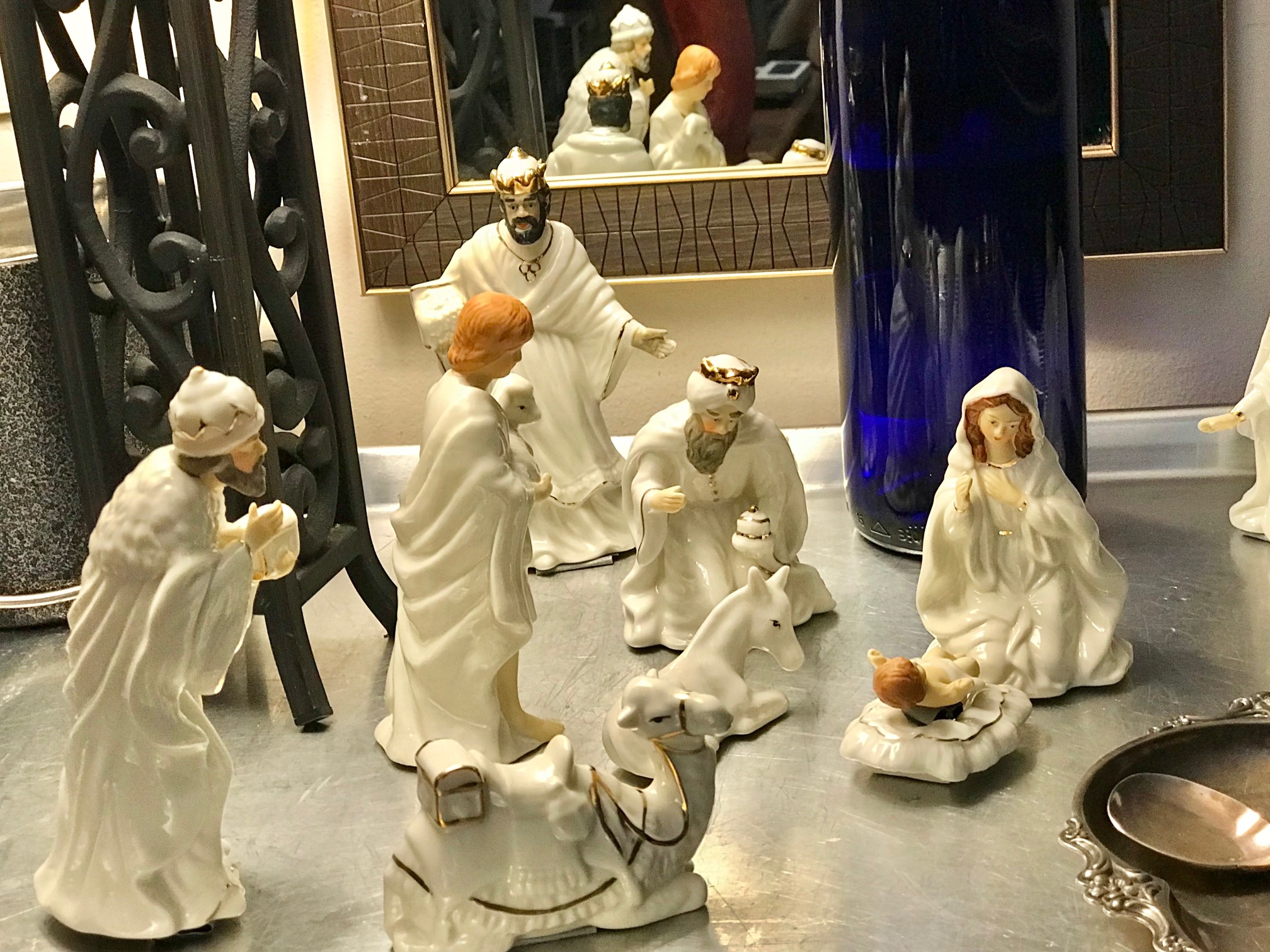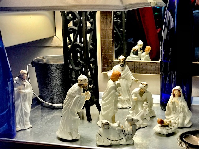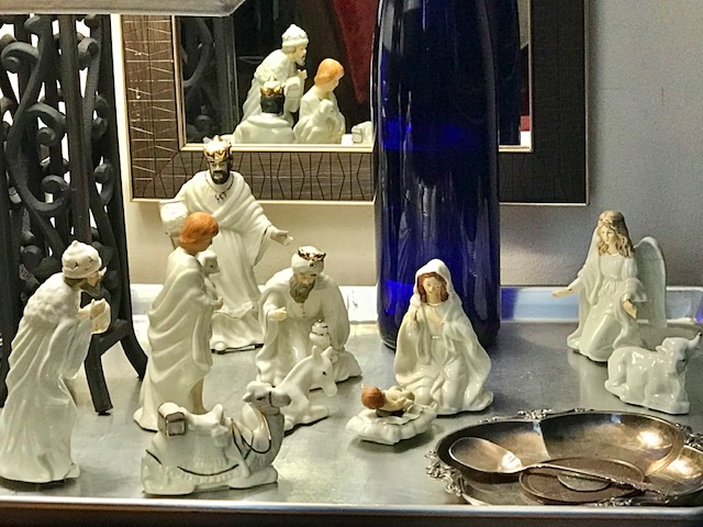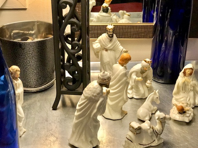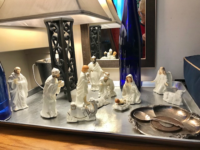 Returning home from a long walk to and from the local stores to stock my pantry pre-Christmas, as I entered my building and rounded the corner to the elevators I saw this little ceramic guy bending toward me, looked like a King or something. Behind him stood a holiday bag, not new, but still fine and festive, so I looked inside and saw several other ceramic figures. I looked about and saw no one, then surmised that because one figurine was removed and positioned to look like it was saying “take me”, the others are in the bag, I thought with a sudden sadness that somebody in the building died and their family left that for whomever wanted it, as a gift from the departed. I didn’t want to disappoint; I received the gift gladly. It must have been meant for me, because now it was mine.